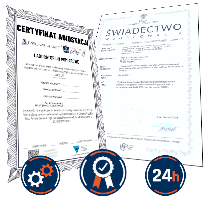 W Polskim Centrum Kalibracji wzorce etanolowe są okresowo badane w Głównym Urzędzie Miar. Potwierdzeniem tego faktu jest poniższe Świadectwo Materiału Odniesienia.