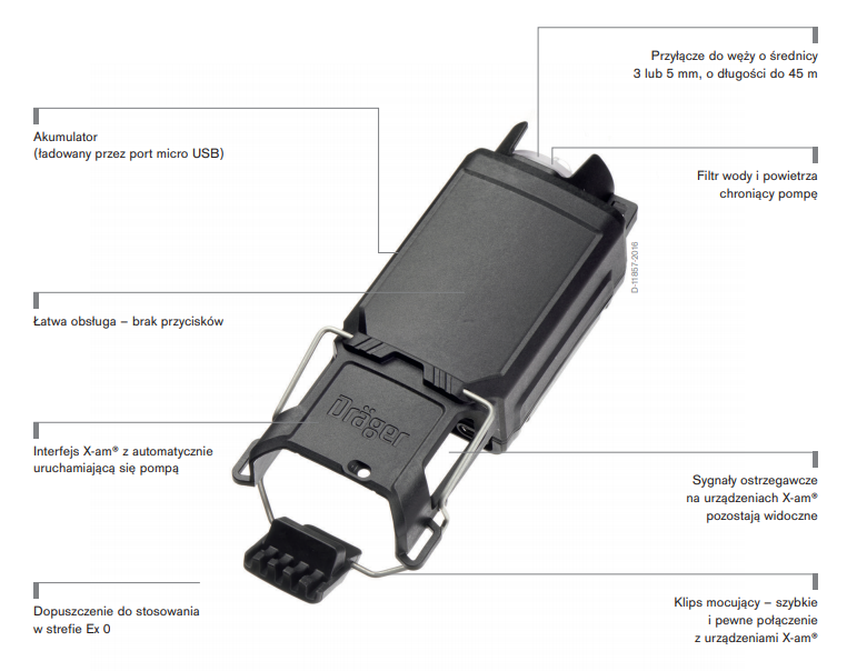 Pompka zewnętrzna do Dräger X-AM to wyjątkowe akcesorium przeznaczone do detektorów gazu marki Dräger. To niezwykle lekkie i kompaktowe urządzenie umożliwia skuteczne dokonywanie pomiarów w trudno dostępnych miejscach, takich jak m.in. szyby wentylacyjne czy różnego rodzaju zbiorniki. Akcesorium posiada klasę szczelności IP67, co oznacza, że jest ono odporne na kurz oraz wodę.